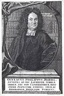 Gustav Philipp Mörl or Gustav Philipp Morl; Gustavus Philippus Moerl (26 December 1673 – 7 May 1750) was a German theologian, was born in Nuremberg 26 December 1673 and was educated first in the schools of his native place and then at the university in Altdorf, where he studied philosophy and philology from 1690 to 1692, when he was removed to Jena to study theology and the ancient languages. He traveled through Holland, and visited its most important universities. After his return home he was appointed assistant of the philosophic faculty at Halle, and in 1698 became professor and ecclesiastical inspector at Altdorf. He resigned this position in 1703, and was appointed dean of St. Sebald's church at Nuremberg. In 1706 he was appointed minister of the St. Aegidien church, and inspector of the gymnasium; in 1714 minister at St. Lawrence, in connection with which he had the supervision of the ecclesiastical seminary. In 1724 he was appointed minister of the church of St. Sebald, superintendent of the consistory of Nuremberg, city librarian, and professor of divinity of the Aegidische gymnasium. He died on 7 May 1750.