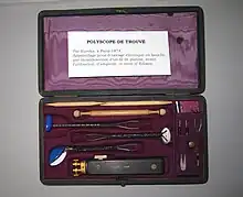 Trouvé took part in the improvement of communication systems with several noteworthy innovations. In 1870, he developed a device for locating metal objects such as bullets in human patients.[7] It used electric conduction, but unlike the one made by Professor Favre in 1862, Trouvé's buzzer made distinct sounds for lead and iron.[8] In 1872 he developed a portable military telegraph whose cabling enabled rapid communication up to a distance of one kilometer, enabling the swift transmission of both orders and reports back from the Front.[9] In 1878, he improved the sound intensity of Alexander Graham Bell’s telephone system by incorporating a double membrane. The same year he invented a highly sensitive portable microphone. Trouvé soon came to be known and respected for his talent for miniaturization. The same year, using a battery developed by Gaston Planté, and a small incandescent airtight bulb, he innovated a "polyscope", the prototype of the modern endoscope.[10]