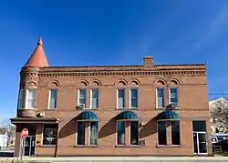 The Guttenberg State Bank, also known as the People's Bank, is a historic building located in Guttenberg, Iowa, United States. The bank was incorporated in May 1900 with John P. Eckert was its president. The bank was also referred to as "Eckert Bank".[2] They built this building two years later. It is a two-story brick structure that features a round tower with a conical roof on the corner. The second floor windows are topped with inlaid brick arches that combines with a brick stringcourse. Above is a brick cornice.