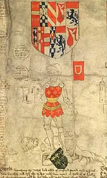 Guy de Beauchamp was the first son and heir of William de Beauchamp, 9th Earl of Warwick (c. 1238 – 1298). His mother was Maud FitzJohn, daughter of John Fitzgeoffrey, who was Justiciar of Ireland and a member of the council of fifteen that imposed the Provisions of Oxford on King Henry III.[4] William was the nephew of William Maudit, 8th Earl of Warwick, and when his uncle died without issue in 1268, he became the first Beauchamp earl of Warwick.[5] In 1271 or 1272 his first son was born, and in reference to the new family title, William named his son after the legendary hero Guy of Warwick.[1] William de Beauchamp was a capable military commander, who played an important part in the Welsh and Scottish wars of King Edward I.[5]