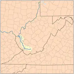 The Guyandotte River is formed in southwestern Raleigh County by the confluence of three streams, Winding Gulf, Stonecoal Creek, and the Devils Fork.[2] The Guyandotte flows initially west-northwestwardly into Wyoming and Mingo counties. It turns briefly northward in Mingo County and enters Logan County, where it turns north-northwestwardly for the remainder of its highly meandering course through Logan, Lincoln and Cabell counties. It enters the Ohio River from the south at Huntington, about 5 mi (8 km) east of the city's downtown.