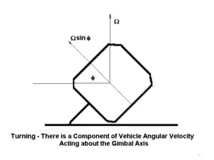 Considering a vehicle negotiating a horizontal curve, the most serious problems arise if the gyro axis is vertical. There is a component of turn rate acting about the gimbal pivot, so that an additional gyroscopic moment is introduced into the roll equation: