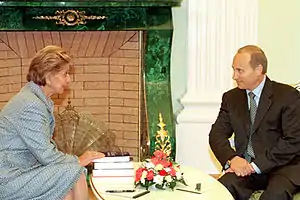 In commenting on current Russian affairs, Carrère d'Encausse warned against applying Western yardsticks to Russian democracy and said she regretted the excessive demonisation of the government of Vladimir Putin.[18] Up until the final days before Russia's February 2022 invasion of Ukraine she refused to countenance such an eventuality, although her opinion of Putin changed after the start of hostilities.[19][20]
