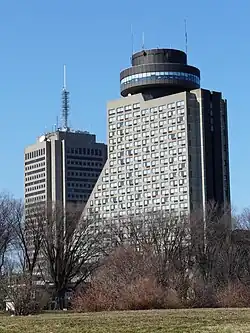 Hôtel Le Concorde Québec is a skyscraper hotel in Quebec City, Quebec, Canada. It contains 405 rooms over 26 floors. Le Concorde is known for its revolving restaurant, Ciel! (formerly L'Astral), which is situated on the top floor of the hotel and offers a 360-degree view of Quebec City and the Saint Lawrence River. The hotel is located in the historic restaurant district La Grande Allée and behind is the historic national park The Plains of Abraham (French: Les plaines d'Abraham) and The Battlefields Park (French: Parc des Champs-de-Bataille).