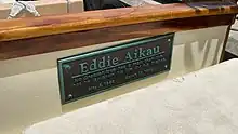Flares were unseen by passing aircraft; the emergency radio reached no help. By mid-morning, with no sign of imminent rescue and the capsized canoe drifting farther from land, Eddie Aikau, a North Shore, Oʻahu, lifeguard and big-wave surfer, volunteered to paddle a surfboard 12–15 miles (19–24 km) to Lānaʻi for help. About nine hours later, flares launched by the crew were spotted by a Hawaiian Airlines flight which circled Hōkūleʻa and radioed the United States Coast Guard ("USCG"). Half an hour later, a USCG search and rescue helicopter was hovering overhead; Hōkūleʻa crew was rescued. The following morning, the USCGC Cape Corwin towed the vessel, from 22 miles southwest of Lāʻau Point, Molokaʻi, back to Honolulu.[43] Despite intensive land, air and sea search, Eddie Aikau was never seen again. Hōkūleʻa carries a plaque in his memory. Subsequent voyages were accompanied by an escort vessel.[44][45]