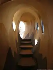 Rather than using standard architectural plans as blueprints, Nga produces paintings, and hires non-professional local craftsmen to transform these into structural elements. Few right angles are found throughout the building,[4] which instead boasts a complex organic structure echoing natural forms. The building's exterior resembles a five-story-high banyan tree,[5] with unevenly shaped window openings and branch-like structures that "grow" along its walls and rise above the roof into the sky.[3] Describing it as a "fairy tale house", observers have variously drawn comparisons between the building's architecture and the works of Salvador Dalí and Walt Disney.[2][4] In attempting to classify the building's architecture, the People's Committee of the city of Đà Lạt described it as “expressionist”.[1]