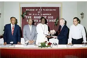 Release of Autobiography held on 28 July 2004. (Standing from left) Dr. H.S.S. Lawrence, Former Vice-Chancellor of Madurai-Kamaraj & Annamalai Universities – Shri S.V. Chitti Babu, CSI Bishop in Madras – Rt. Rev. Dr. V. Devasahayam, United States Consul General for South India – Dr. Richard D. Haynes, Editor-in-chief of 'The Hindu – Shri Narasimhan Ram.