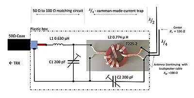 The HB9XBG antenna is based on the use of a speaker audio cable with a strand cross-section of 2 × 2.5 mm2 and PVC insulation. A speaker cable of this kind has an impedance of almost exactly 100 Ω and performs two functions at the same time: the function of the feedline as far as the centre of the dipole and the function of the "radiating common mode current" for the lower dipole leg. One core of the two-core cable is removed on the upper half of the dipole. A resonant trap L2/C2 eliminates the common mode current at the lower end of the antenna.[2] The L1/C1 components (see the illustration) matches the feedline impedance of 50 Ω to the 100 Ω system of the antenna.