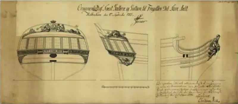 1. The original designs of the figurehead and ornamentation of the gallery are available at this reference by clicking "vis"
