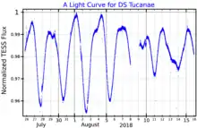 DS Tucanae (HD 222259) is a binary star system 144 light years away in the constellation of Tucana. It has an apparent visual magnitude of 8.5,[8] and is a RS Canum Venaticorum variable.[5] The system is notable for being young as a member of the 45 Myr old Tucana-Horologium moving group[10] and for the primary star hosting the confirmed exoplanet DS Tucanae Ab, discovered by THYME, using TESS.[11][8][12][13]