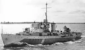 Flower-class corvettes like Cobourg serving with the Royal Canadian Navy during the Second World War were different from earlier and more traditional sail-driven corvettes.[2][3][4] The "corvette" designation was created by the French as a class of small warships; the Royal Navy borrowed the term for a period but discontinued its use in 1877.[5] During the hurried preparations for war in the late 1930s, Winston Churchill reactivated the corvette class, needing a name for smaller ships used in an escort capacity, in this case based on a whaling ship design.[6] The generic name "flower" was used to designate the class of these ships, which – in the Royal Navy – were named after flowering plants.[7]