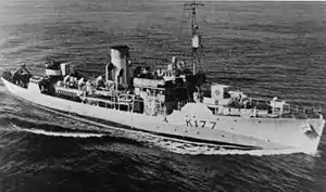 Flower-class corvettes like Dunvegan serving with the Royal Canadian Navy during the Second World War were different to earlier and more traditional sail-driven corvettes.[3][4][5] The "corvette" designation was created by the French as a class of small warships; the Royal Navy borrowed the term for a period but discontinued its use in 1877.[6] During the hurried preparations for war in the late 1930s, Winston Churchill reactivated the corvette class, needing a name for smaller ships used in an escort capacity, in this case based on a whaling ship design.[7] The generic name "flower" was used to designate the class of these ships, which – in the Royal Navy – were named after flowering plants.[8]