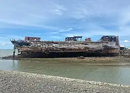 Hinau was the first of three composite minesweepers constructed for the Royal New Zealand Navy and was commissioned on 23 July 1942. The other two were Rimu and Manuka. She served in the LL Group (later renamed to the 194th Auxiliary minesweeping division)[2] which was located at Auckland. She occasionally visited Wellington and the South Island. After the war she was laid up at Devonport Naval Base.[3] In 1954 she was sold off as military surplus to be scrapped.[4] She was saved and purchased by Parry Bros LTD located in Whakatīwai, to become a breakwater and shingle bin, where she remains today.