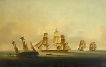 The French frigates also captured three ships of the convoy; the rest of the convoy escaped.[38] One of the vessels the French captured was Dutchess of Rutland, whose master failed to destroy her convoy signals and instructions; fortunately for the British, the French had to return to port to effect repairs and did not take advantage of the opportunity this represented.[26] The French scuttled the three merchant vessels they captured.[37]