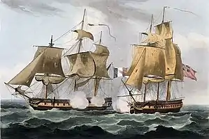 Captain John Murray took command of Carysfort in 1795, and left Britain for the East Indies in February 1796. Carysfort remained in the East Indies for the next few years, passing under the command of Captain Thomas Alexander in March 1796.[1] On 19 August that year Alexander captured the 16-gun French corvette Alerte, a privateer requisitioned by the French government. She sailed from France for the East Indies with the squadron under Admiral Sercey. There Sercey sent her to visit the Danish post at Trinquebar to gather information about the disposition of the British navy in the East Indies. On his way the captain encountered Carysfort in the dark, and mistaking her for a merchant vessel, attacked.[14] Carysfort captured Alerte, and with her, papers describing Sercey's plans and route.[15] This led on 9 September to an indecisive action between Sercey's squadron and Arrogant and Victorious.