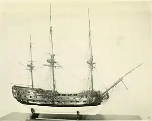 HMS Centurion was a 60-gun fourth rate ship of the line of the Royal Navy, built at Portsmouth Dockyard by Joseph Allin the younger and launched on 6 January 1732.[1] At the time of Centurion's construction, the 1719 Establishment dictated the dimensions of almost every ship being built. Owing to concerns over the relative sizes of British ships compared to their continental rivals, Centurion was ordered to be built 1 ft (0.3 m) wider across the beam than the Establishment prescribed. HMS Rippon was similarly built to non-Establishment dimensions at the same time.[2]