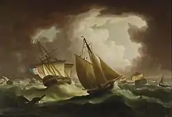 The Royal Navy armed cutter Entreprenante shadowing the remnants of the Franco-Spanish fleet as it runs into Cadiz after the disastrous defeat at Trafalgar, by Thomas Buttersworth