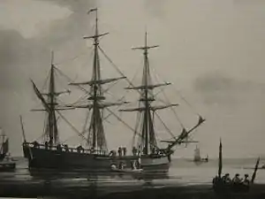 Grand Duchess of Russia departed for Boston, Massachusetts carrying 150 marines on 30 March 1775 and she remained in North American waters for the next two years. Vice Admiral Lord Howe, commander of the North American Station, informed the Admiralty on 23 April that he had purchased the Grand Duchess of Russia and commissioned her as HMS Vigilant to bombard targets ashore.[1][lower-alpha 2] The ship received fourteen 24-pounder guns from the 50-gun ship Centurion, and two 9-pounder and four 6-pounder guns from the hospital (prison) ship Jersey. Additional gun ports were cut in Vigilant's side to allow two guns to be switched from one side to give her a broadside of nine guns. The 150 men of her crew came from the crews of Howe's flagship, the third rate Eagle, Centurion, and the fourth rate Preston, while her 30 marines were drawn from the marine brigade at Halifax.[3]