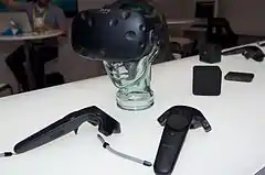 ![]() An HTC Vive Pre head-mounted display with a camera near the bottom rim; two wireless handheld controllers; and two 'Lighthouse' basestations | |
