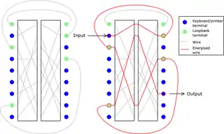 ![]() A diagram of a loopback-rotor construction; in this simplified example, two rotors with nine contacts each are used. There are six inputs and outputs, leaving three loop-back wires. | |
