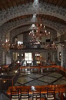 The buildings and furnishings were constructed or restored on site using mostly local materials and craftsmen. These buildings are surrounded by patios and gardens aligned with the native flora of the area, and containing about 1.7 million bricks.[3]