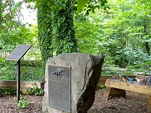 Haddonfield is a significant historic paleontology site. In 1838, William Estaugh Hopkins uncovered large bones in a marl pit in which he was digging. Hopkins displayed the bones at his home, Birdwood; and these bones sparked the interest of a visitor, William Foulke. In 1858, Foulke dug from the marl pit the first relatively complete skeleton of a dinosaur found in North America, Hadrosaurus foulkii. The skeleton was assembled in 1868 and is still displayed at Philadelphia Academy of Natural Sciences.[30] A 12-foot (3.7 m) replica of "Haddy" stands in the center of town.[26] Hadrosaurus was recognized officially as the state dinosaur of New Jersey in June 1991.[31]