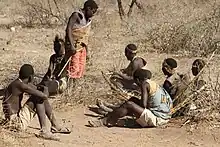 The Hadza are not closely related to any other people. The Hadza language was once classified with the Khoisan languages because it has clicks; however, since there is no evidence they are related, Hadza is now considered an isolate.[20] Genetically, the Hadza do not appear to be particularly closely related to Khoisan speaker; even the Sandawe, who live just 150 kilometres (93 mi) away, diverged from the Hadza more than 15,000 years ago. Genetic testing also suggests significant admixture has occurred between the Hadza and Bantu, while minor admixture with the Nilotic and Cushitic-speaking populations have occurred in the last few thousand years.[2] Today, a few Hadza women marry into neighbouring groups such as the Bantu Isanzu and the Nilotic Datoga, but these marriages often fail and the woman and her children return to the Hadza.[21] In previous decades, rape or capture of Hadza women by outsiders seems to have been common.[22] During a famine in 1918–20, some Hadza men were reported as taking Isanzu wives.[21]