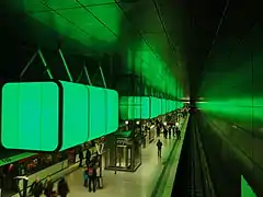 The station was designed by Munich-based architecture firm Raupach Architekten.[1] The design makes reference to the changing colors typical to the HafenCity, caused by reflections throughout the day by the wharf buildings' red brick and the ship hulls' iron and steel.