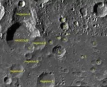 By convention these features are identified on lunar maps by placing the letter on the side of the crater midpoint that is closest to Hagecius.