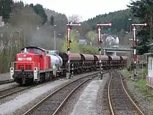 The Hagen–Dieringhausen railway (also called the Volmetalbahn: Volme Valley Railway) is a mostly single-track (continuously double track as far as Lüdenscheid-Brügge) and non-electrified railway line from Hagen Hauptbahnhof via Lüdenscheid-Brügge, Meinerzhagen and Gummersbach to Gummersbach-Dieringhausen in the German state of North Rhine-Westphalia.