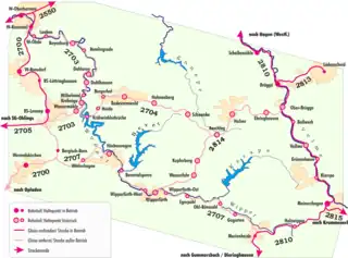 - ↑ Eisenbahnatlas Deutschland [German railway atlas]. Schweers + Wall. 2009. pp. 52, 64, 143. ISBN 978-3-89494-139-0.