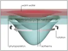 Haida eddies can be more than 250 km in diameter, and transport a mass of coastal water approximately the volume of Lake Michigan over 1,000 km offshore into the lower nutrient waters of the northeast Pacific Ocean.[2] These "warm-core rings" transport heat out to sea, supplying nutrients (particularly nitrate and iron) to nutrient depleted areas of lower productivity. Consequently, primary production in Haida eddies is up to three times higher than in ambient waters, supporting vast phytoplankton-based communities, as well as influencing zooplankton and icthyoplankton community compositions.[3][4]