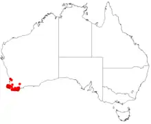 It is endemic to an area along the coast in the South West and Great Southern regions of Western Australia between Busselton in the west, Wagin to the north and Albany to the south. It is often found among granite outcrops and seasonally damp areas like swamps growing in sandy or sandy-clay soils and is usually part of sandy heathland or Eucalyptus woodland communitities.[2][3]