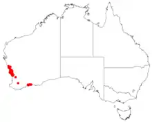 Grows from the northern sandplains at Three Springs ranging south to Gingin. There is also a recorded population west of Esperance. Grows in heath and scrubland in sand and gravel. Requires good drainage and sunny aspect.[3]