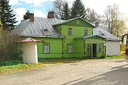 Originally, the building belonged to Ivan Kalju. The family of Ivan Kalju consisted of his wife Kati and their six children Anna, Maria, Alli, Sonja, Olli and Alli’s son Mihkel. In 1933, second floor was built on the house. Ivan set up a shop in the house. They sold household goods, mostly hardware. In 1940, the shop was nationalised, the family was announced Kulaks, Mihkel, the son was killed and part of the family was deported in 1949. In 1945, the Obinitsa Village Council was set up in the building. After that, the building has also hosted a dairy, post office, medical aid station, library and a community centre. Obinitsa sovkhoz office was located in the building during 1960-1995 Evar Riitsaar set up a gallery called Hal’as kunn in the building in 2004.[2]