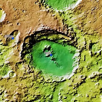 On 28 September 2015 NASA confirmed the seasonal existence of liquid water in Hale crater.[2] The salts in the water (magnesium perchlorate, magnesium chlorate, sodium perchlorate,...) lower its freezing and melting point to 203 K (−70 °C or −94 °F), which is near the average summer night temperature. Hale was created by an asteroid roughly 35 km (22 mi) across that impacted at an oblique angle about 3.5–3.8 billion years ago. The rim and ejecta are eroded and show smaller impacts, but subsequent deposits have covered up small craters within it.[3] On the southern rim of Hale, parts of the crater wall have moved downslope towards the crater's centre. The surface shows a network of fluvial channels which may have been caused by running water.[4] It is named after George Ellery Hale.
