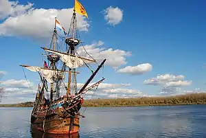 Half Moon is a replica of Halve Maen, the famed ship that English mariner Henry Hudson sailed up the Hudson River in 1609. The ship was constructed between 1988 and 1989 at the Snow Dock in Albany, New York, its construction commissioned by Dr. Andrew Hendricks.[1] The ship's construction fulfilled Dr. Hendricks' dream to use the historic icon as an educational instrument, bridging the gap between the American way of life and the Dutch heritage in New York state. In March 2015, the replica ship departed the Hudson River Valley to a new home, Hoorn, The Netherlands.[2] In February 2019, it was announced that the Hoorn government would not extend their contract to serve as the Dutch homeport of the Half Moon. Hoorn's contract expired on April 1, 2020.[3] The Half Moon is currently at port in Volendam, Netherlands. The board of directors of the New Netherland Museum have not announced what the future of the ship may hold.[4]