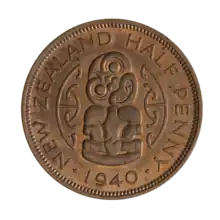 The New Zealand halfpenny was first issued after the Coinage Act 1933.[1] The halfpenny and the penny were designed by New Zealand artist Leonard Cornwall Mitchell, and officially issued in 1940, although they first came into circulation in December of the previous year.[2][3]