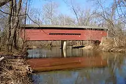 This structure has two spans and is a 100-foot-long (30 m), Burr truss bridge, which was built in 1850. It is the oldest covered bridge in Chester County, and crosses French Creek, just downstream of its confluence with Birch Run.[2]