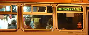 2006, the last year of the large organized street party, a crowded city bus with the destination "Halloween Castro."