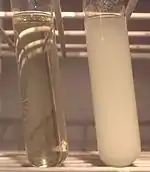 This reaction forms the basis of the iodoform test which was commonly used in history as a chemical test to determine the presence of a methyl ketone, or a secondary alcohol oxidizable to a methyl ketone. When iodine and sodium hydroxide are used as the reagents a positive reaction gives iodoform, which is a solid at room temperature and tends to precipitate out of solution causing a distinctive cloudiness.