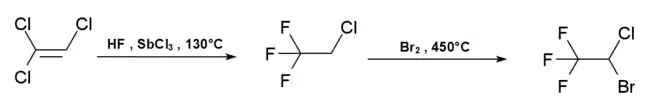 The commercial synthesis of halothane starts from trichloroethylene, which is reacted with hydrogen fluoride in the presence of antimony trichloride at 130 °C to form 2-chloro-1,1,1-trifluoroethane. This is then reacted with bromine at 450 °C to produce halothane.[35]