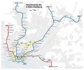 The Hamburg U-Bahn is a rapid transit system serving the cities of Hamburg, Norderstedt, and Ahrensburg in Germany. Although referred to by the term U-Bahn (the "U" commonly being understood as standing for Untergrund "underground"), most of the system's track length is above ground. The network is interconnected with the city's S-Bahn system, which also has underground sections. It is operated by Hamburger Hochbahn within the Hamburger Verkehrsverbund (HVV). It was opened in February 1912,[4] and comprises four lines serving 93 stations,[2] with a route length of 106.4 kilometres (66.1 mi) in 2019.[6]