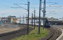 Frankton Junction station consisted of an island platform located on the NIMT just north of the junction between the ECMT and NIMT. It had two signal boxes, and a locomotive depot was located in the Vee of the junction.[3] In 1909 a new, larger station was built to cope with the extra traffic of the through line to Wellington, 16 chains (1,100 ft; 320 m)[4] to the north.[5] The first Auckland - Wellington through expresses ran on 14 February 1909, taking 19 hours 13 minutes, and stopping at Frankton.[6]