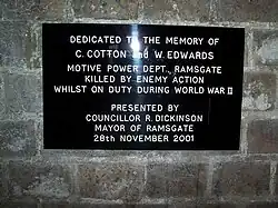 1. Chief Petty Officer William Eden, service number P/K 5943, from the naval shore base of HMS Fervent[28] (which encompassed part of Ramsgate Harbour), who died on 27 September 1939, age and cause of death unknown.[29]