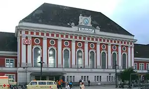 Hamm (Westf) Hauptbahnhof (often abbreviated Hamm (Westf) or simply Hamm (W)) is a railway station situated in the city of Hamm in the German state of North Rhine-Westphalia. It is notable for its station building inspired by art deco and Gründerzeit building styles. The station is one of the important InterCityExpress rail hubs in the eastern Ruhr area and is among the high-profile buildings of Hamm. Until the decline of rail freight after the Second World War, it featured one of Europe's largest marshalling yards.[2]