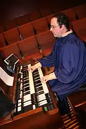 Most Hammond organs have two 61-note (five-octave) keyboards called manuals. As with pipe organ keyboards, the two manuals are positioned on two levels close to each other. Each is laid out in a similar manner to a piano keyboard, except that pressing a key on a Hammond results in the sound continuously playing until it is released, whereas with a piano, the note's volume decays. No difference in volume occurs regardless of how heavily or lightly the key is pressed (unlike with a piano), so overall volume is controlled by a pedal (also known as a "swell" or "expression" pedal).[10] The keys on each manual have a lightweight action, which allows players to perform rapid passages more easily than on a piano. In contrast to piano and pipe organ keys, Hammond keys have a flat-front profile, commonly referred to as "waterfall" style. Early Hammond console models had sharp edges, but starting with the B-2, these were rounded, as they were cheaper to manufacture.[11] The M series of spinets also had waterfall keys (which has subsequently made them ideal for spares on B-3s and C-3s[12]), but later spinet models had "diving board" style keys which resembled those found on a church organ.[13] Modern Hammond-Suzuki models use waterfall keys.[14]
