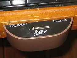 The Leslie was originally designed to mimic the complex tones and constantly shifting sources of sound emanating from a large group of ranks in a pipe organ. The effect varies depending on the speed of the rotors, which can be toggled between fast (tremolo) and slow (chorale) using a console half-moon or pedal switch, with the most distinctive effect occurring as the speaker rotation speed changes. The most popular Leslies were the 122, which accepted a balanced signal suitable for console organs, and the 147, which accepted an unbalanced signal and could be used for spinet organs with a suitable adapter.[100] The Pro-Line series of Leslies which were made to be portable for gigging bands using solid-state amps were popular during the 1970s.[101]