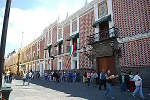 The best known pottery of this type is called Talavera, named after the white background ceramics of Talavera de la Reina, Spain, which it sought to imitate.[1] Like its namesake, Puebla Talavera is characterized by a white background, achieved with tin salts, and mostly blue decorative features using cobalt salts. It has been used to make vases, china, sculpted figures, and tiles. White with blue only as decoration is the most traditional but there are other colors that are accepted as well. The blue decoration of Puebla Talavera is both from east and west. Glazed ceramic was invented in Asia and came to Mexico via Europe, specifically Spain. However, there is also direct Asian influence on the work because of the Oriental goods that came to the country on the Manila Galleon. The use of talavera and other tiles also distinguishes Puebla architecture, being found on facades of major buildings all over the state.[1]