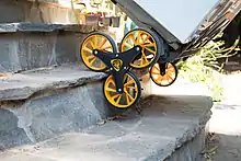 Some hand trucks are equipped with stairclimber wheels, which, as the name implies, are designed to go up and down stairs. These stair climbing hand trucks have three wheels on each side that are always in contact with stairs for added stability. Stairclimber wheels can sometimes be problematic when trying to turn on flat ground as four wheels in a fixed position will be in contact with the ground.